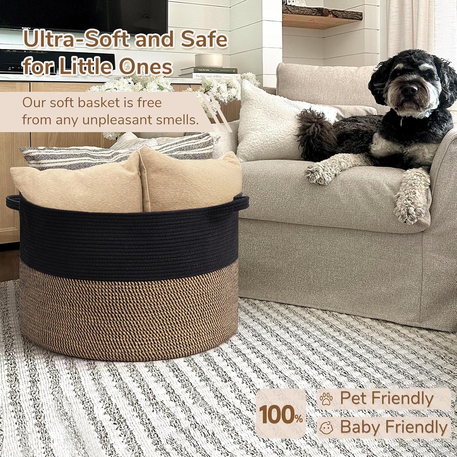 I originally bought this basket as a decorative blanket holder, but it ended up being the perfect storage solution for my dog’s toys! It’s sturdy, stylish, and blends in nicely with my home decor—no more plastic bins or scattered toys everywhere.The size is just right—not too bulky, but it holds a surprising amount. My dog even knows it’s his toy spot and will go over to grab what he wants. The material is soft yet structured, so it keeps its shape but is safe for pets to interact with.Highly recommend if you’re looking for something functional and beautiful—whether it’s for blankets or pet toys!